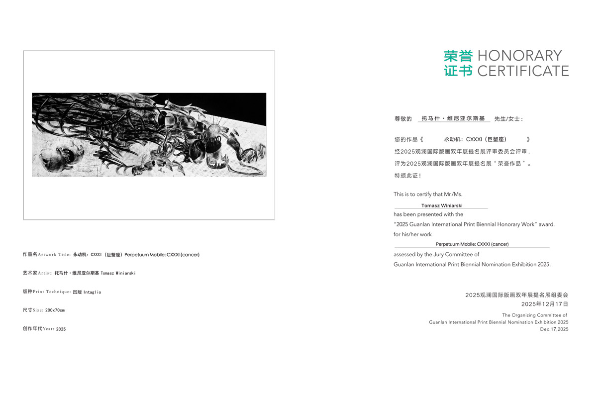 Dr Marlena Biczak i dr Tomasz Winiarski zdobyli dwie spośród 10 równorzędnych nagród głównych w 2025 China Guanlan International Print Biennial. W biennale, które jest jednym z najważniejszych wydarzeń w sferze grafiki artystycznej, wzięło udział ponad 200 artystek i artystów z całego świata.