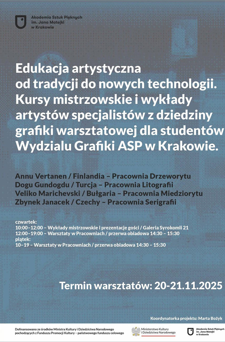 Od 17.11. do 22.11.2025 gościmy na Wydziale Grafiki artystów z 4 krajów, którzy poprowadzą warsztaty mistrzowskie dla studentów w 4 pracowniach grafiki warsztatowej. Warsztaty zakończy wystawa w grudniu 2025 w galerii WG Syrokomli 21.