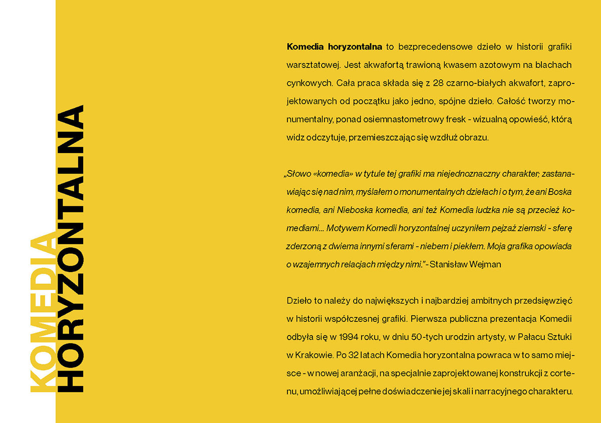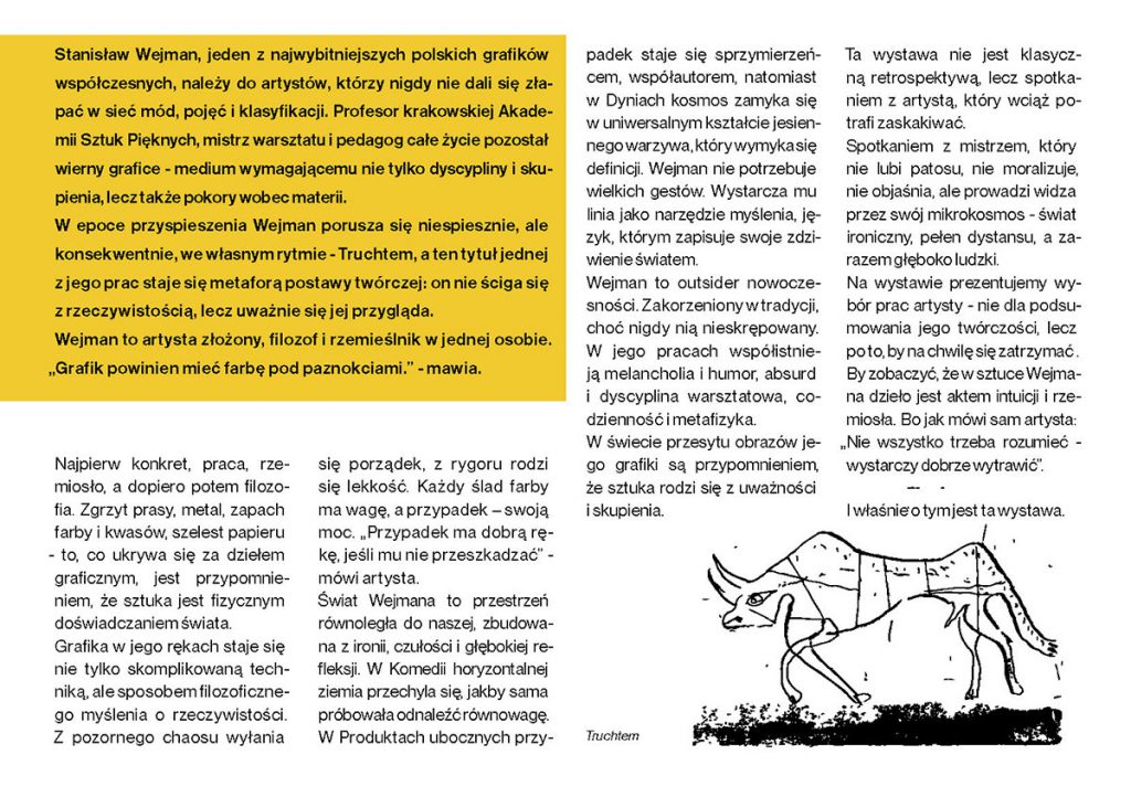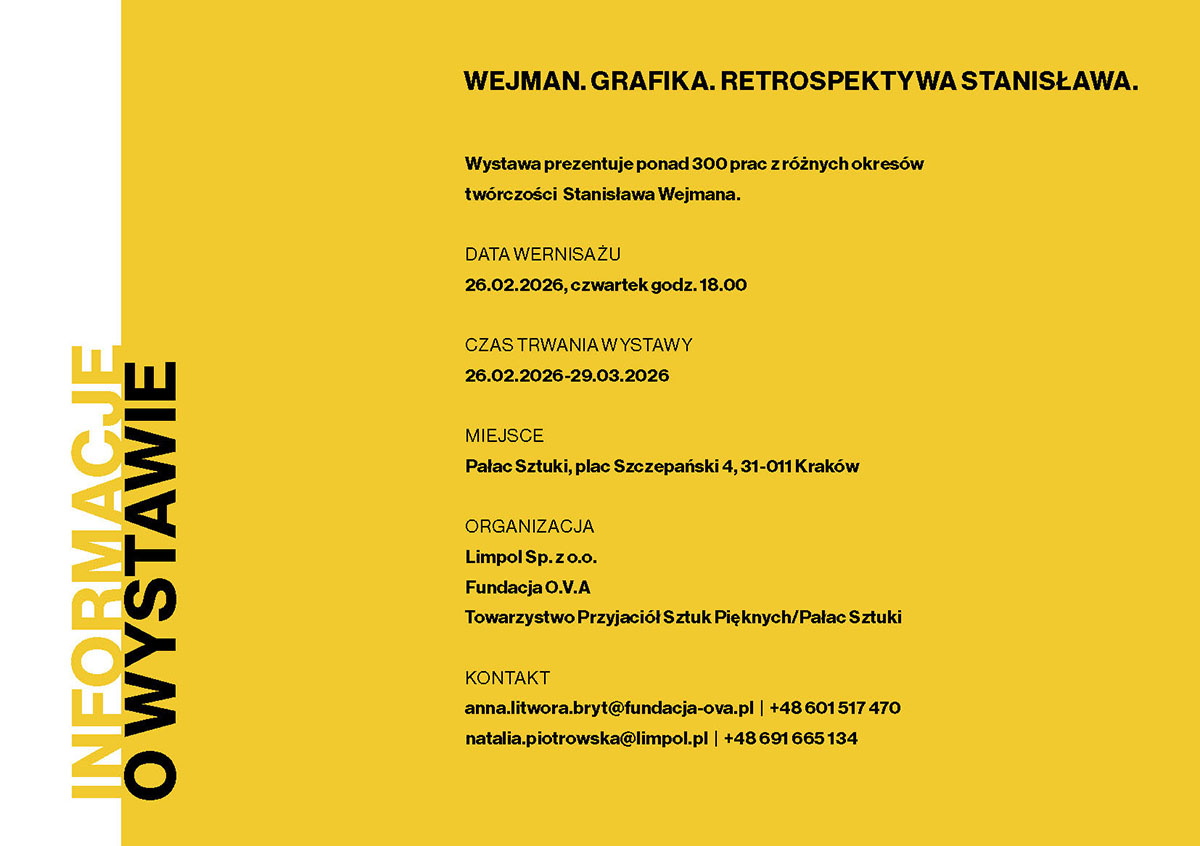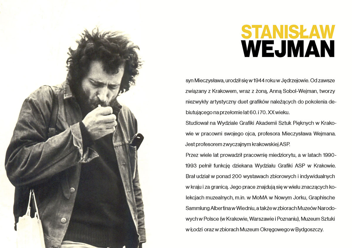 26 lutego będziemy mieli wyjątkową możliwość zanurzyć się w obszar twórczości Profesora Stanisława Wejmana — osobowości dla mojego pokolenia wyjątkowej, formatywnej, a dla młodszego, dla studentów, zapewne do ponownego odkrycia i zafascynowania się. Od 12 lat profesor emerytowany, a wcześniej kierownik Pracowni Miedziorytu, którą prowadził przez ponad 30 lat, przejmując ją po ojcu, Mieczysławie, wraz z filozofią roli artysty i pedagoga.